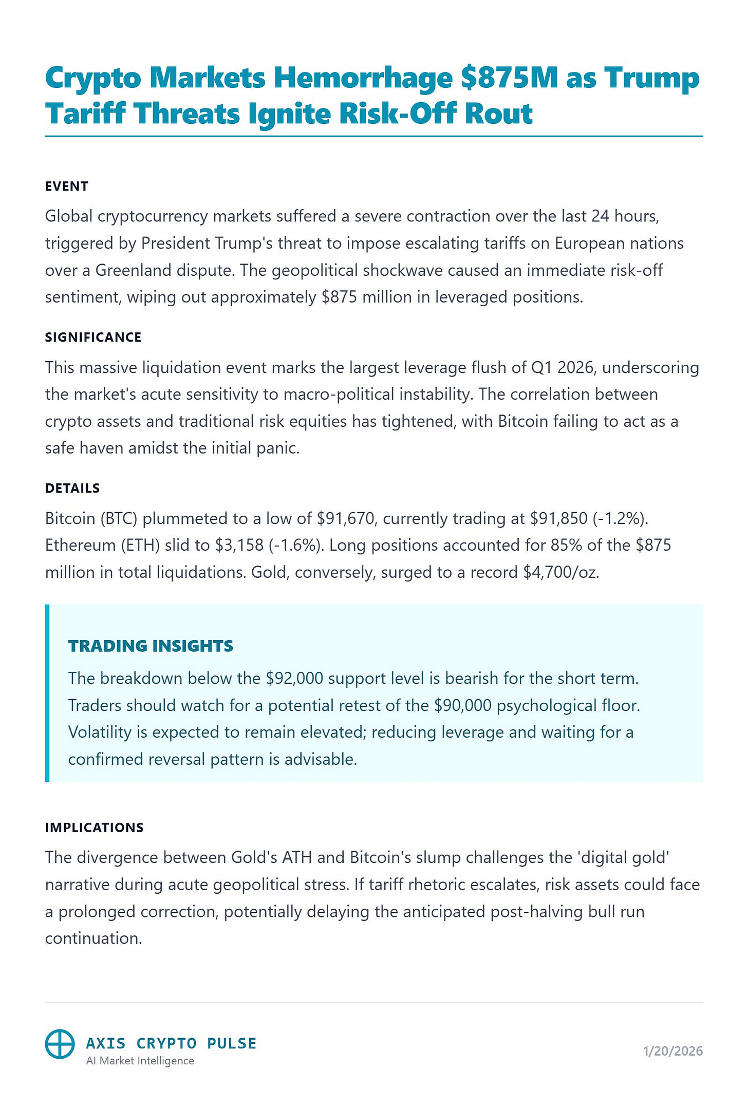 Event: Global cryptocurrency markets suffered a severe contraction over the last 24 hours, triggered by President Trump’s threat to impose escalating tariffs on European nations over a Greenland dispute. The geopolitical shockwave caused an immediate risk-off sentiment, wiping out approximately $875 million in leveraged positions.